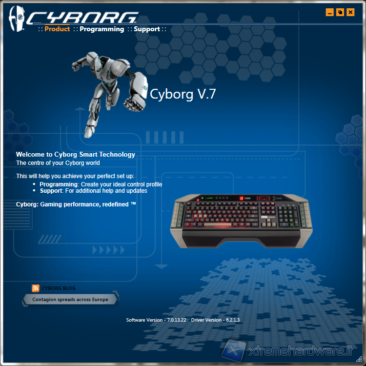 Il software si divide in tre schermate, la prima identifica il dispositivo (il software di gestione è unico per tutti le periferiche Cyborg), la seconda schermata permette di configurare i tasti, la terza schermata è invece dedicata al supporto.